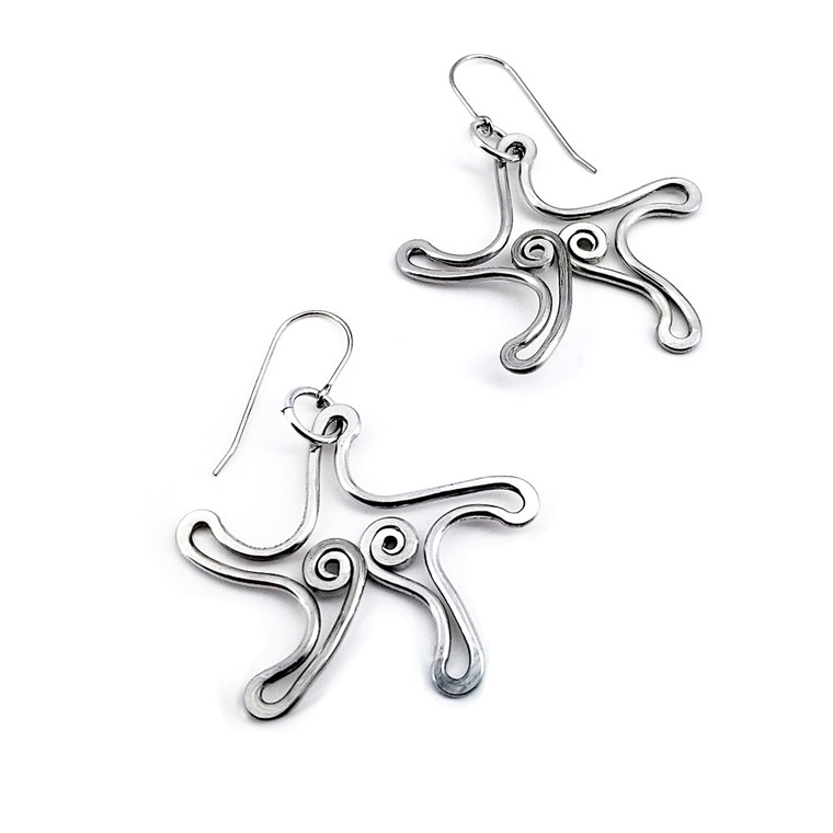 These starfish-shaped earrings are crafted from recycled aluminum by artist Jay Schiavone in North Carolina. They are not only light in weight, they are earth friendly and won't tarnish. The j-hook is made from sterling silver. The earrings measure 1¼” wide with a 1¾” drop.
