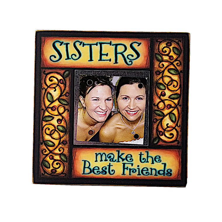 This colorful picture frame features original artwork by Michael Macone and the saying, "Sisters make the best friends" The frame is printed with archival ink on archival paper which is attached to wood and UV coated so it will last a lifetime. A sheet metal square with four super-strong rare earth magnets is designed to secure the photo in place. The frame can sit on a desk using by placing the dowel on the back, or can be hung on a wall with a nail. Frame is 5 1/4" x 5 1/4" and holds a 2 1/4" x 2 1/4" photograph.